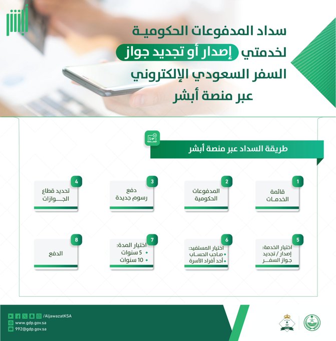 حددت المديرة العامة للجوازات 8 خطوات لسداد المدفوعات الحكومية لخدمتي إصدار وتجديد جواز السفر السعودي الإلكتروني عبر منصة ”أبشر”.
