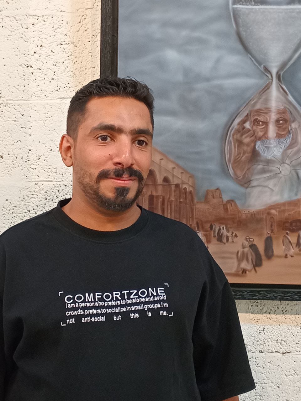 بالبداية كان الشغف منذ الصغر بالمدرسة الابتدائية والمتوسطة، وكنت مهوسًا برسم الطبيعة والمباني القديمة والتشكيل بالصلصال. وقطعت فترة طويلة إلى عام ٢٠٢١م، وكان المحفز الأول لي الفنان المصري كريم عادل شجعني وأعطاني الدافع لتعلم مبادى فن البورتريه بقلم الرصاص والفحم، وصقلت الموهبة بتعلم تقنيات الألوان الزيتية، وفن الآيربرش عام ٢٠٢٢م على يد الفنان حافظ الرضي، وطورت هذه التقنية من خلال التغذية البصرية بالسوشل ميديا، وطورت في فن الآيربرش بتعدد الخامات انطلاقًا من ألوان الأكليريك إلى الألوان النارية وألوان حبر بالآيربرش.