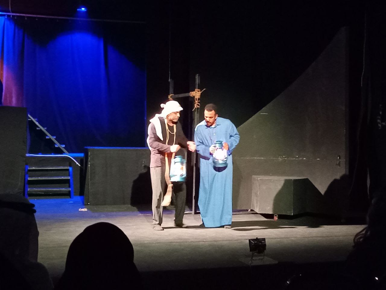 ومن اللافت جدًا أسلوب استغلال العتمة والنور، الذي برع فيه مخرج العمل سلطان النوه، وكذلك ثبات شخصية غامضة مغطاة الوجه تقف على شرفة عالية، تدق الطبل بين المشاهد لإذكاء الحماس وتعزيز التفاعل مع الاستعراضات الفلكلورية وأحداث المسرحية.