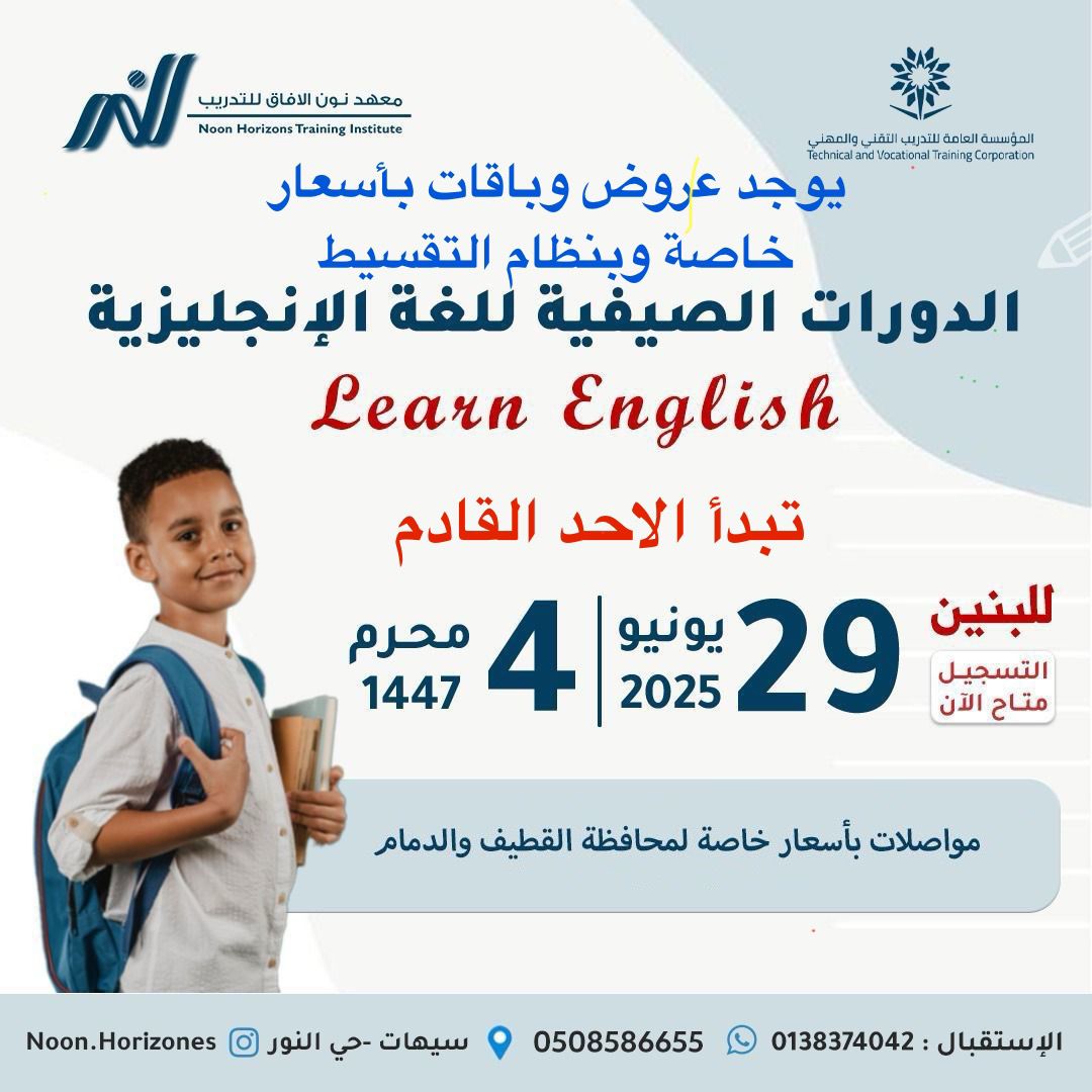 بدأ التسجيل لدورات اللغة الإنجليزية حضوري للبنين بمعهد نون الآفاق بسيهات للإجازة الصيفية ٢٠٢٥م: