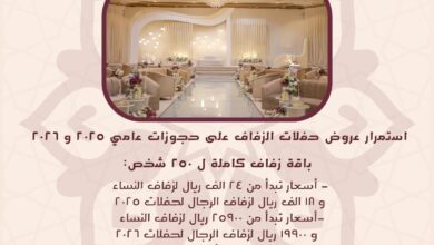 عروض مركز الأمير فيصل بن فهد للمناسبات بمناسبة العام الهجرى الجديد استمرار عروض حفلات الزفاف على حجوزات عامي ٢٠٢٥ و…