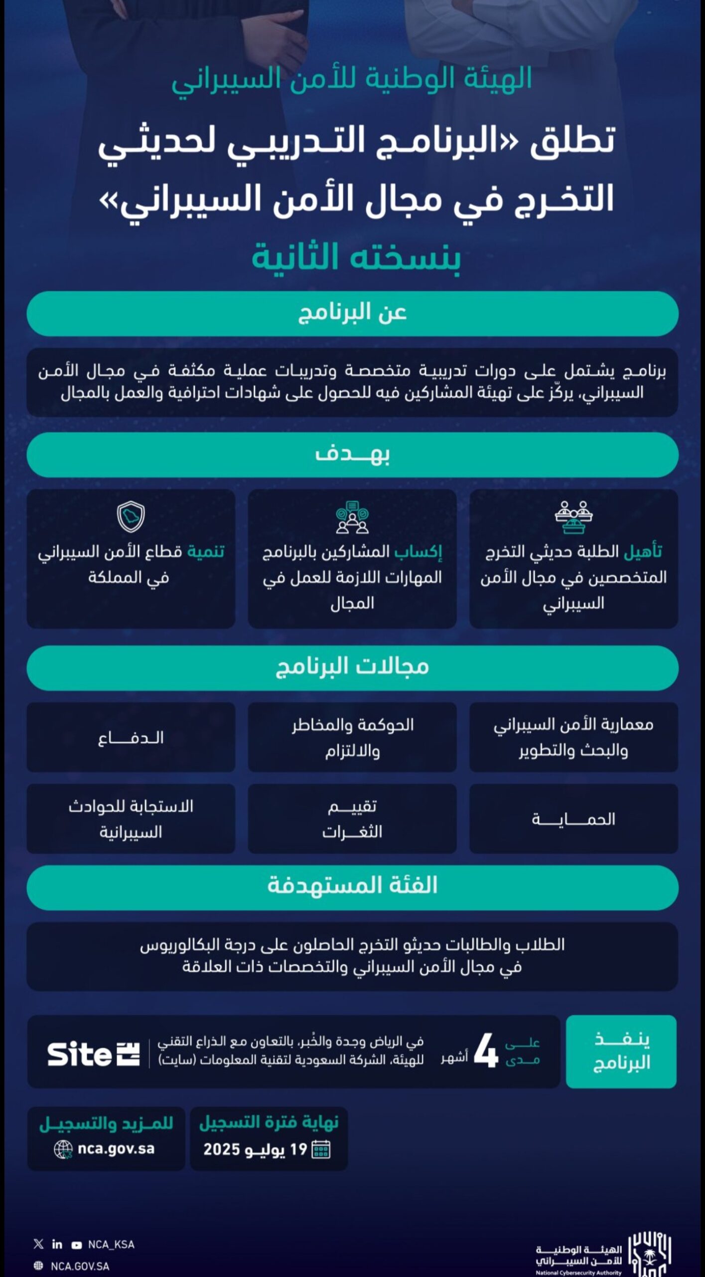 ويستهدف البرنامج تدريب الطلاب والطالبات حديثي التخرج الحاصلين على درجة البكالوريوس في كافة تخصصات الأمن السيبراني والتخصصات ذات العلاقة، وإكسابهم المهارات الأساسية اللازمة وفق الاحتياجات الحالية والمستقبلية في مجال الأمن السيبراني، وذلك على مدى أربعة أشهر في الرياض وجدة والخُبر، بالتعاون مع الذراع التقني للهيئة، الشركة السعودية لتقنية المعلومات “سايت”.