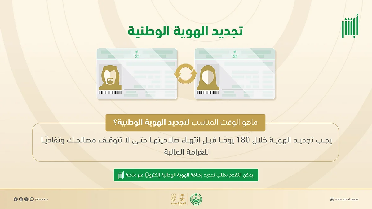 وأكدت “الأحوال المدنية” أن التأخر في تجديد الهوية قد يؤدي إلى تعطل بعض الخدمات المرتبطة بها، مشيرة إلى أن عملية التجديد أصبحت متاحة إلكترونيًا بكل يُسر عبر منصة “أبشر”.