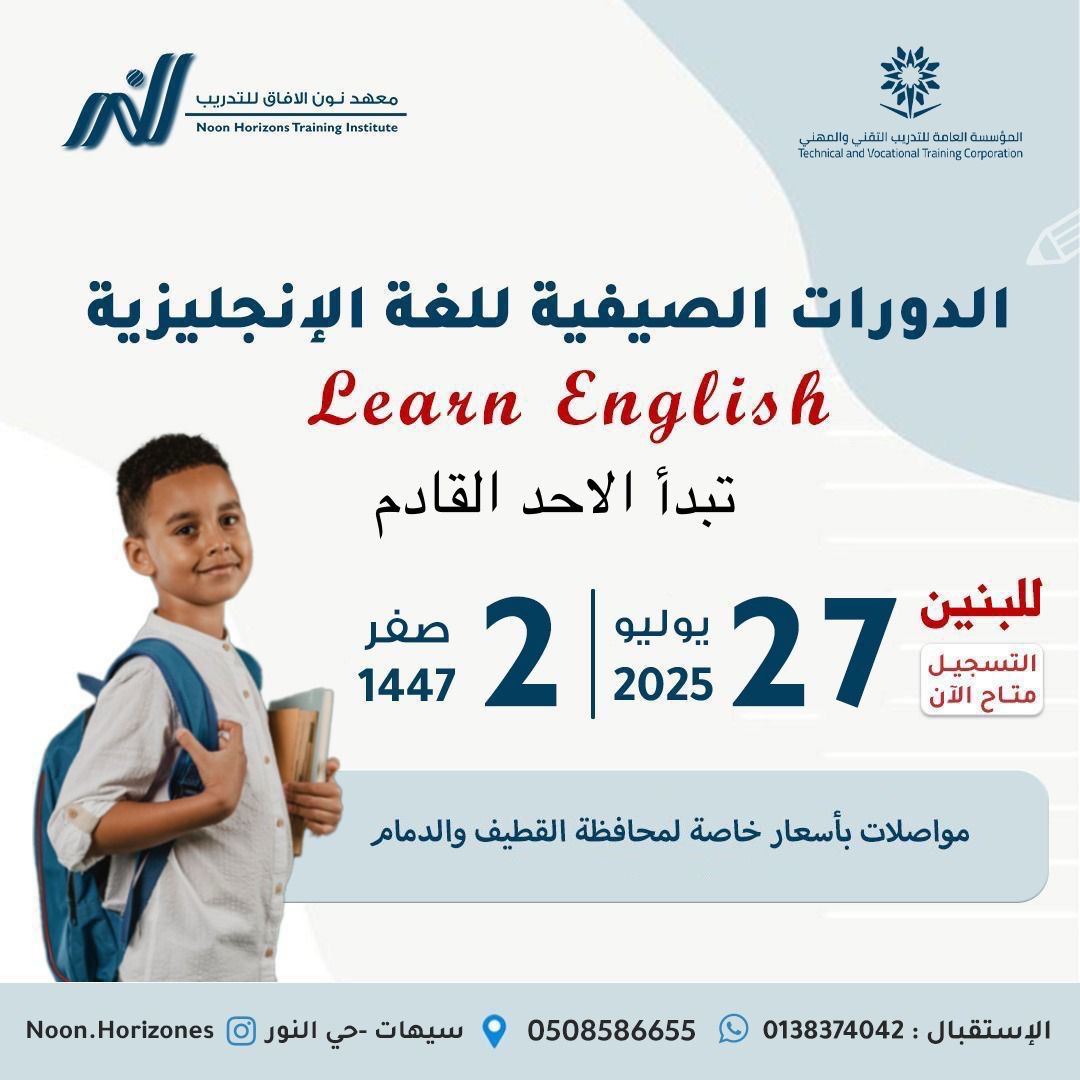 التسجيل مستمر لدورات اللغة الإنجليزية حضوري للبنين بمعهد نون الآفاق بسيهات للإجازة الصيفية ٢٠٢٥م: