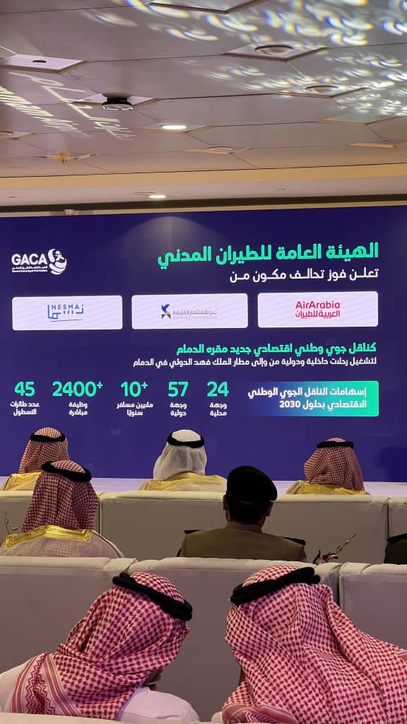 أعلنت الهيئة العامة للطيران المدني، اليوم، عن فوز تحالف يضم شركة “نسما للطيران” و”العربية للطيران” و”شركة كيان للاستثمار” بتشغيل ناقل جوي وطني اقتصادي جديد، سيكون مقره مطار الملك فهد الدولي بالدمام.