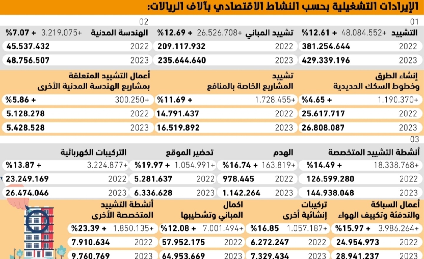 في صدارة الأنشطة التي أسهمت في هذا النمو، جاء نشاط تشييد المباني الذي شهد زيادة كبيرة بلغت 26.5 مليار ريال، حيث ارتفعت الإيرادات من 209.1 مليارات ريال في 2022 إلى 235.6 مليار ريال في 2023، بنسبة نمو بلغت 12.7%، مما يجسد الزخم الذي يشهده قطاع الإسكان والمشاريع التجارية والسياحية في مختلف مناطق المملكة.