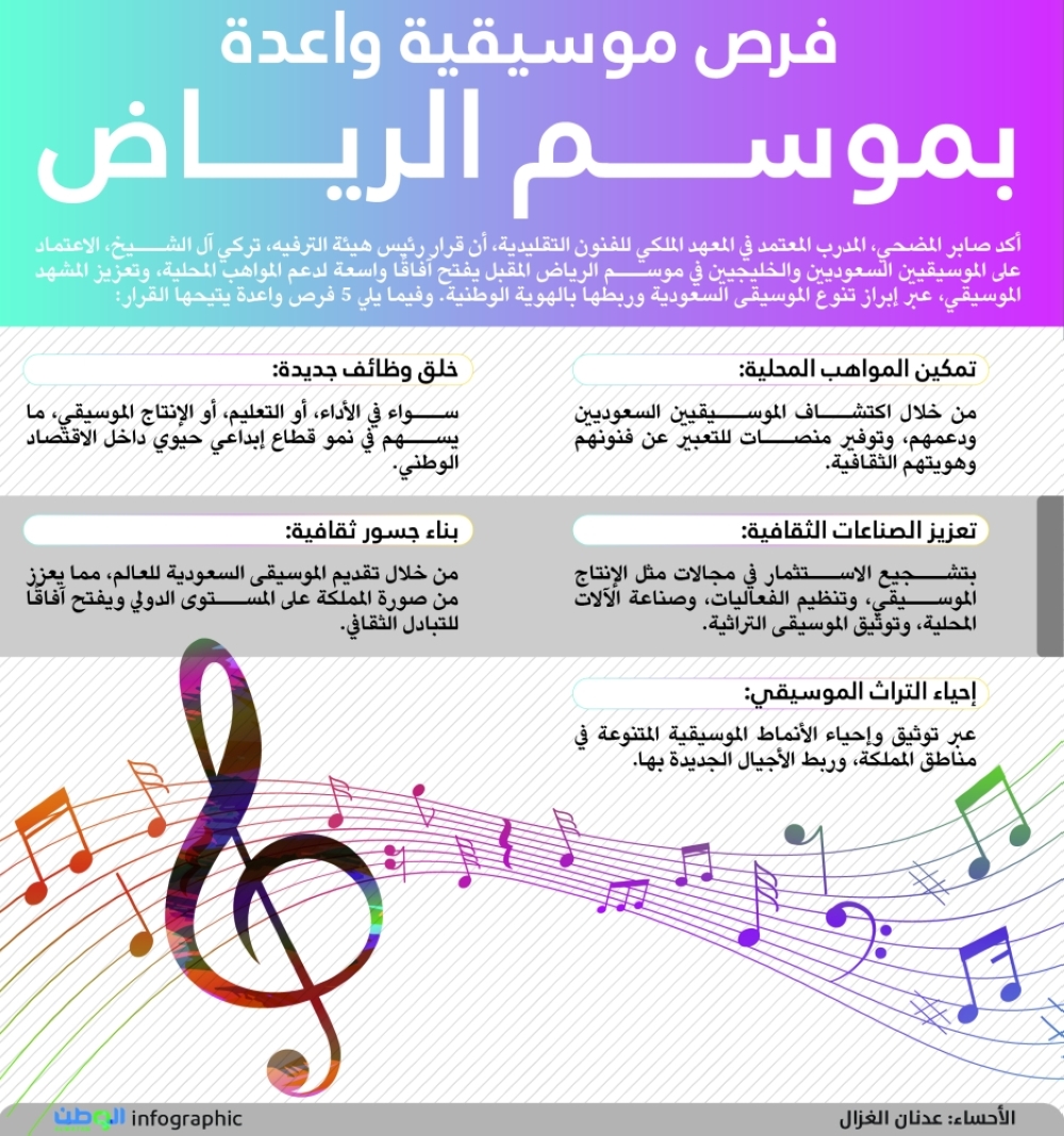 أكد صابر المضحي، المدرب المعتمد في المعهد الملكي للفنون التقليدية، أن قرار رئيس هيئة الترفيه، تركي آل الشيخ، الاعتماد على الموسيقيين السعوديين والخليجيين في موسم الرياض المقبل يفتح آفاقًا واسعة لدعم المواهب المحلية، وتعزيز المشهد الموسيقي، عبر إبراز تنوع الموسيقى السعودية وربطها بالهوية الوطنية. وفيما يلي 5 فرص واعدة يتيحها القرار: