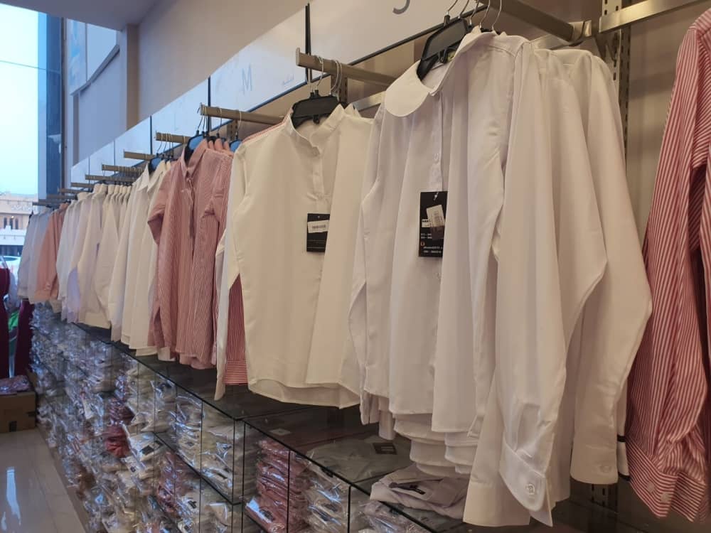 فيما ترتدي البنات قميصًا أبيض بياقة كحلية طويلًا وساترًا من الأمام والخلف أو قميصًا أبيض طويلًا وساترًا من الأمام والخلف مع بنطال رياضي طويل كحلي وسترة كحلية طويلة.