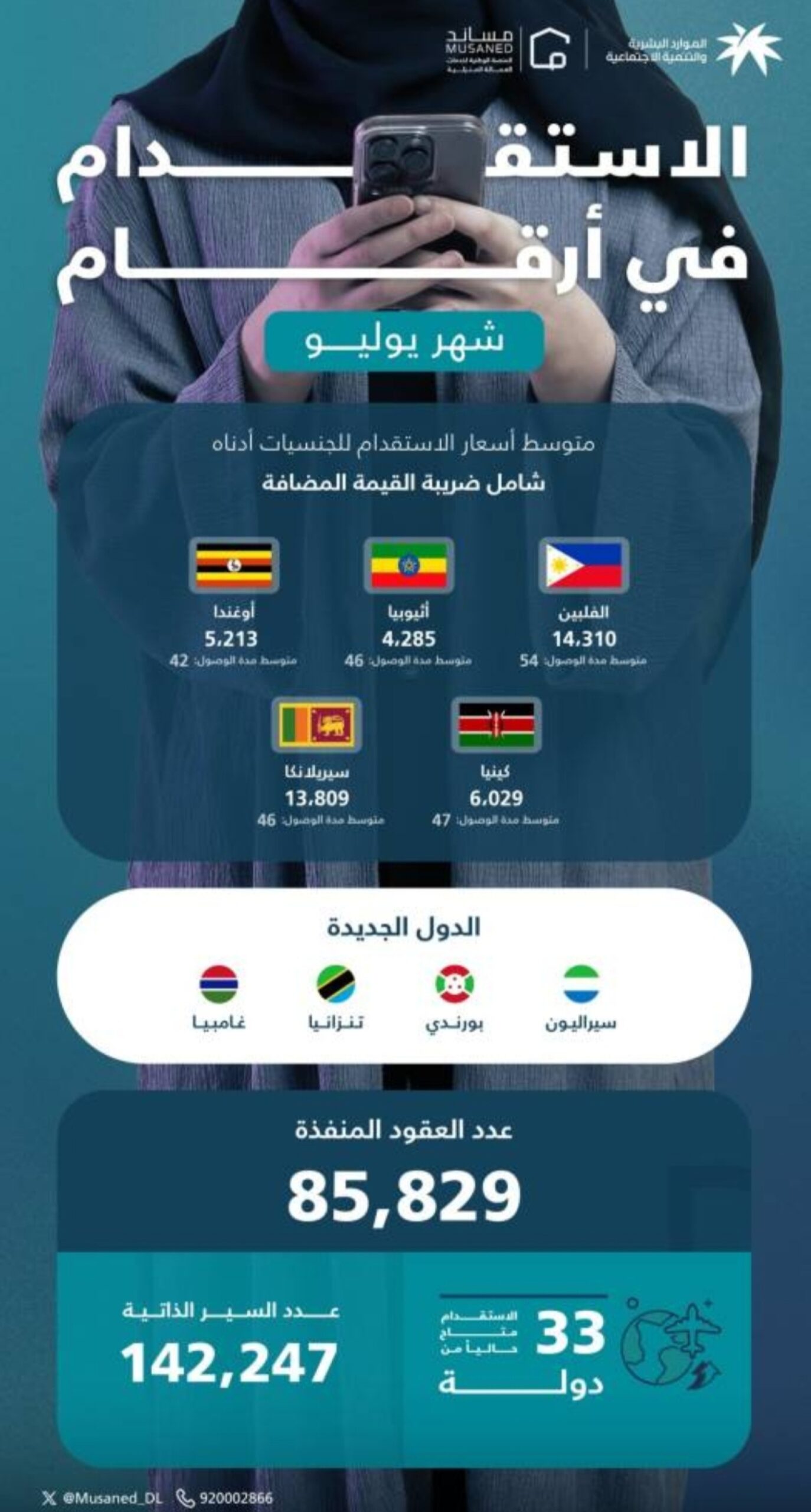 كما أعلنت المنصة عن إضافة 4 دول جديدة إلى قائمة الدول المتاحة للاستقدام، وهي: غامبيا، تنزانيا، بوروندي، وسيراليون، ليصبح إجمالي عدد الدول المتاحة عبر “مساند” 33 دولة.