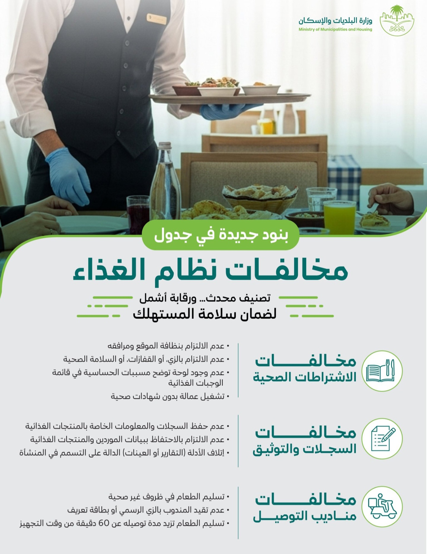 أطلقت وزارة البلديات والإسكان، بالتعاون مع الهيئة العامة للغذاء والدواء جدول مخالفات نظام الغذاء المحدث؛ بهدف تعزيز السلامة الغذائيَّة، ورفع مستوى الامتثال النظامي لدى المنشآت الغذائية، وذلك ضمن جهود متكاملة لحماية الصحة العامة وتطوير منظومة الرقابة على الغذاء.