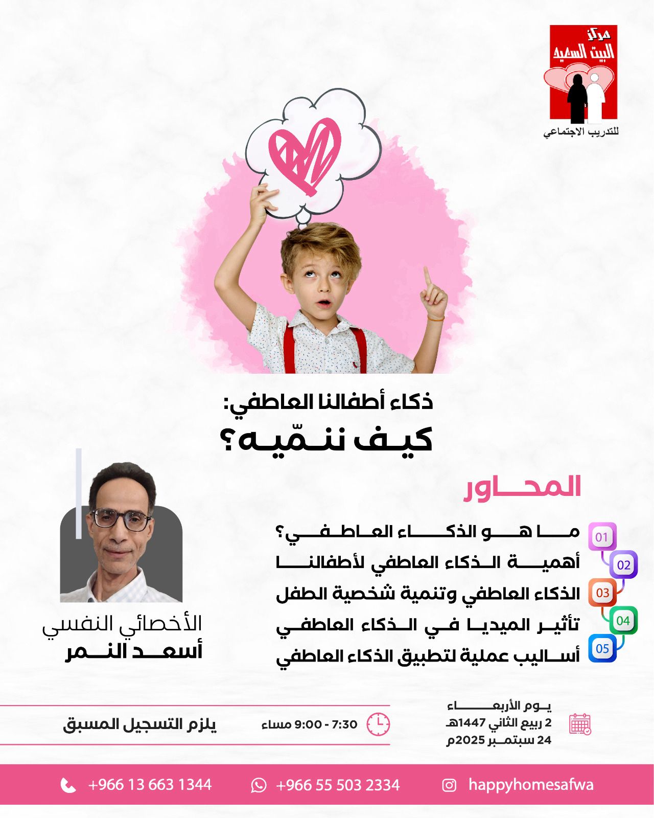 ينظم مركز البيت السعيد للتدريب الاجتماعي مساء يوم الأربعاء 2 ربيع الآخر 1447هـ الموافق 24 سبتمبر 2025م، محاضرة بعنوان: «ذكاء أطفالنا العاطفي: كيف ننمّيه؟»، يقدمها الأخصائي النفسي أسعد النمر، وذلك من الساعة 7:30 وحتى 9:00 مساءً.