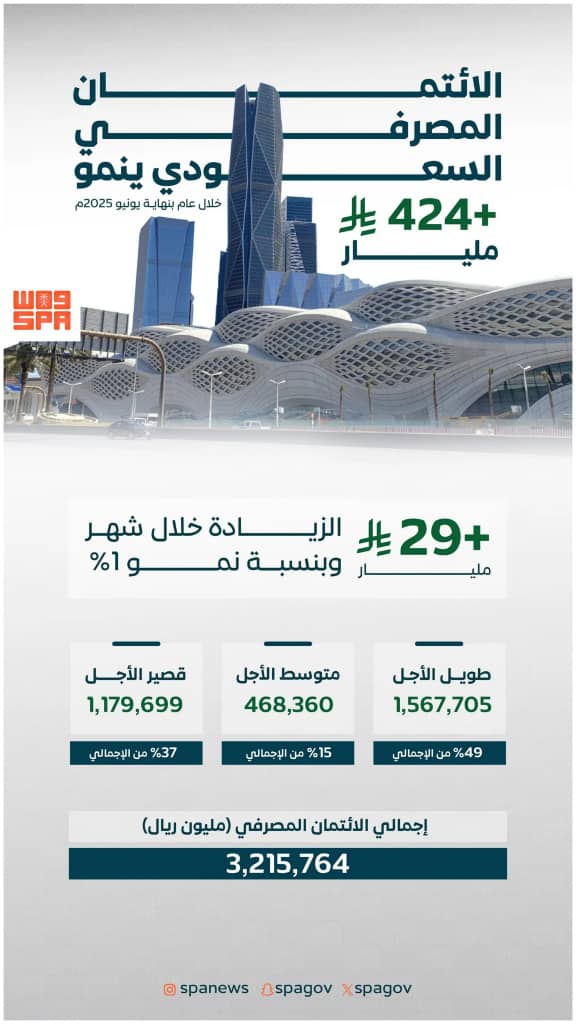 وأوضحت النشرة الإحصائية الشهرية الصادرة عن البنك المركزي السعودي لشهر يوليو 2025م، أن إجمالي الائتمان المصرفي حقق كذلك نموًّا شهريًّا بنسبة تقارب (1%) بزيادة بلغت (29,493) مليون ريال مقارنةً بشهر يونيو الماضي، الذي بلغ فيه الائتمان المصرفي (3,186,271) مليون ريال.