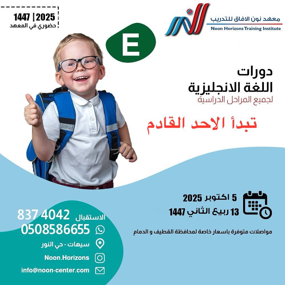 بادر بالتسجيل لدورات اللغة الإنجليزية حضوري للبنين بمعهد نون الآفاق بسيهات: