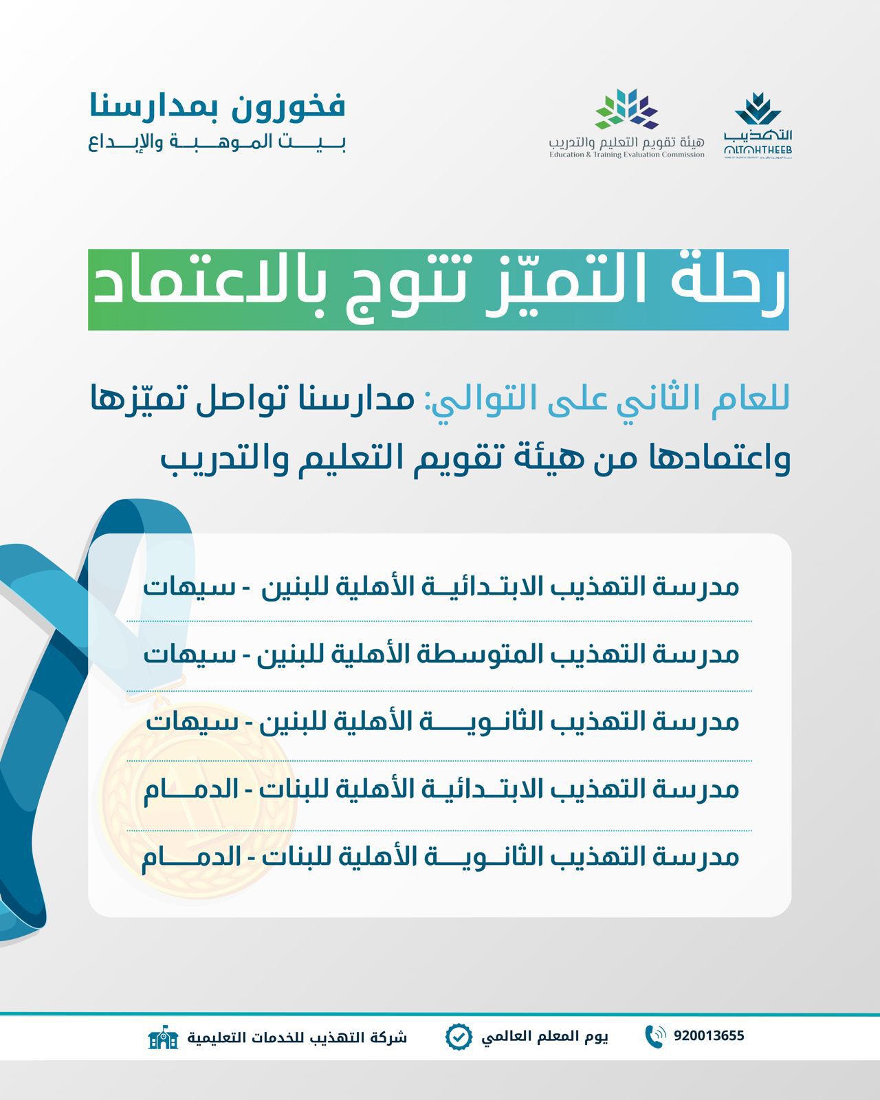تستمر مدارس التهذيب في كتابة قصة نجاحها للعام الثاني على التوالي، حيث أثبتت تميزها من خلال اعتمادها من هيئة تقويم التعليم والتدريب، لتكون بذلك من بين أفضل المدارس المتميزة في المملكة. يشمل هذا الاعتماد خمس مدارس متميزة في سيهات والدمام:
