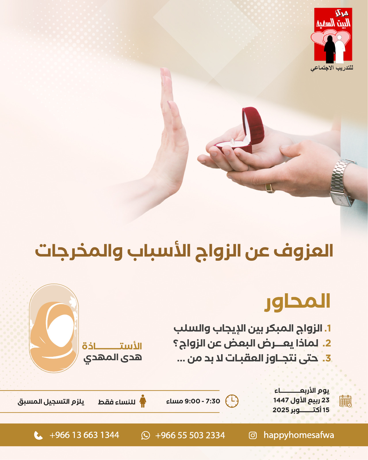 ينظم مركز البيت السعيد اليوم الأربعاء 15 أكتوبر لقاءً تثقيفيًا بعنوان “العزوف عن الزواج: الأسباب والمخرجات”، تقدمه الأستاذة هدى المهدي، وذلك من الساعة 7:30 مساءً حتى 9:00 مساءً.