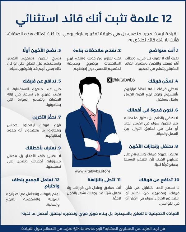 في خطوة نوعية تهدف إلى تعزيز مفاهيم القيادة الإيجابية، نشر حساب @kitabwbs عبر منصاته الرقمية إنفوغرافيك بعنوان “12 علامة تثبت أنك قائد استثنائي”، قدّم من خلاله مجموعة من الصفات والسلوكيات التي تميّز القائد الحقيقي عن غيره، مؤكدًا أن القيادة ليست منصبًا أو سلطة، بل أسلوب تفكير وطريقة حياة.