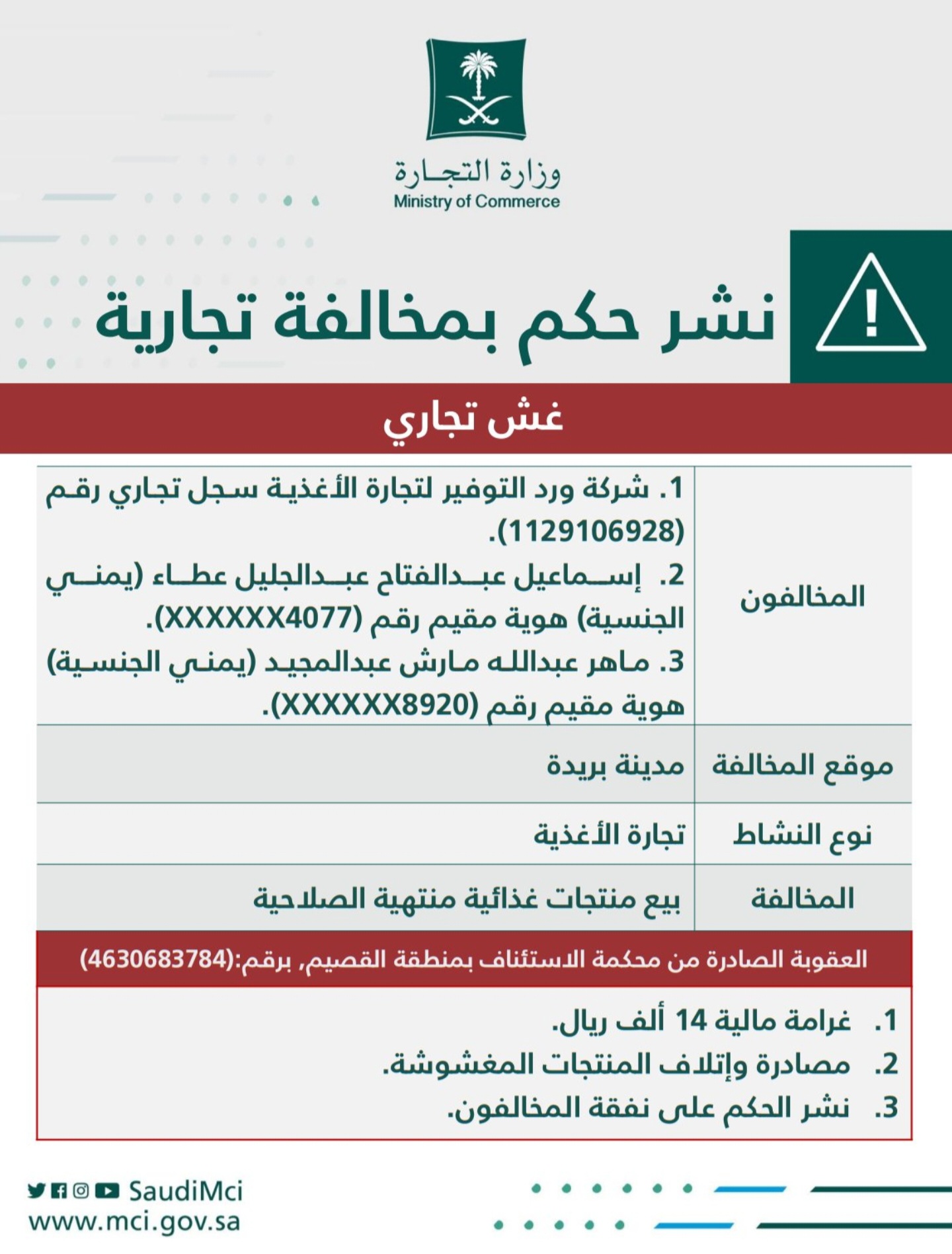 ونشرت الوزارة مضمون الحكم القضائي النهائي المؤيد من محكمة الاستئناف بمنطقة القصيم المتضمن فرض غرامة مالية على المخالفين قدرها 14 ألف ريال، ومصادرة وإتلاف البضاعة المغشوشة، ونشر الحكم على نفقة المخالفين.