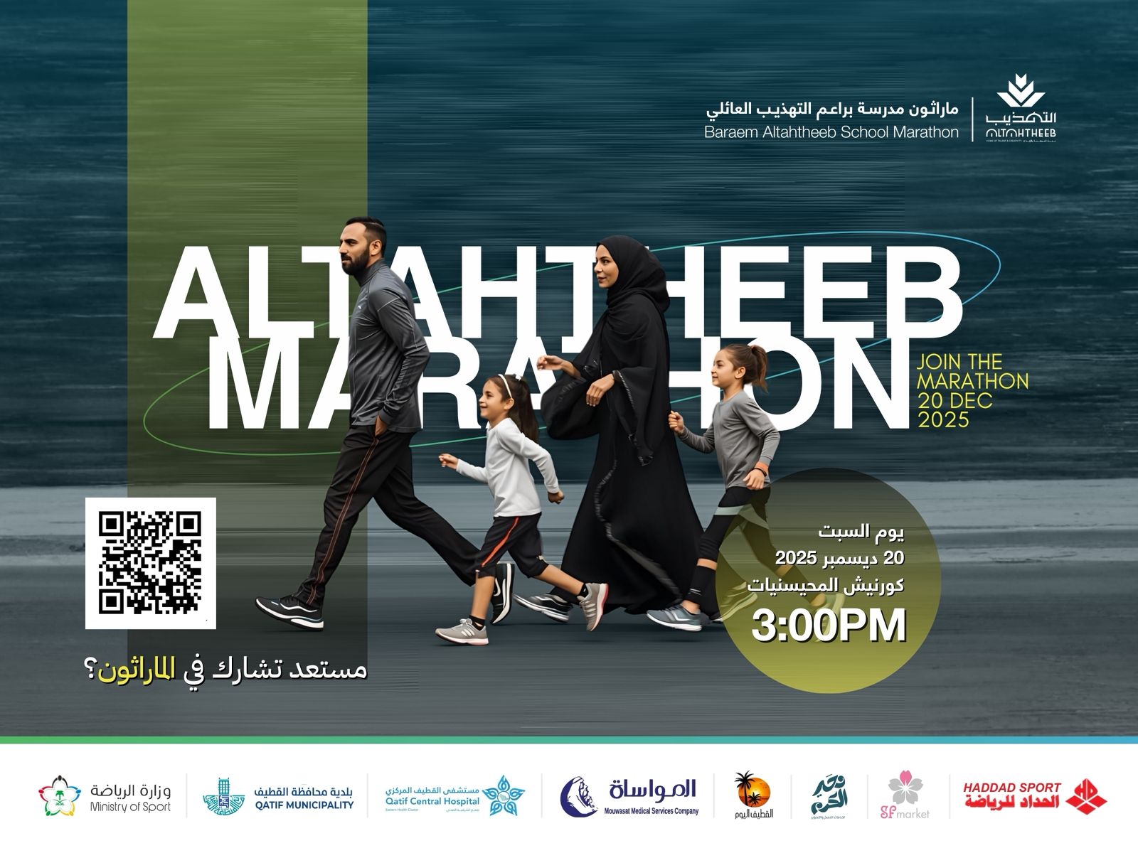 تقيم شركة التهذيب للخدمات التعليمية بالشراكة مع وزارة الرياضة وبلدية القطيف، ماراثون المشي العائلي، والذي يستهدف جميع أفراد العائلة بمختلف أعمارهم، تعزيزًا لمفهوم النشاط البدني ونشر ثقافة نمط الحياة الصحي في المجتمع.