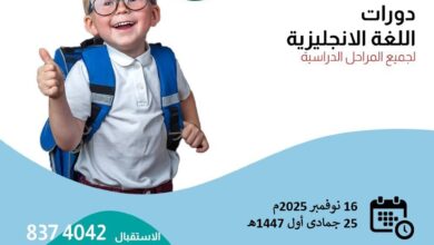 بادر بالتسجيل لدورات اللغة الإنجليزية حضوري للبنين بمعهد نون الآفاق بسيهات: الاحد ٢٦ جمادى اول ١٤٤٧هـ الموافق ١٦ نوفمبر ٢٠٢٥م.…