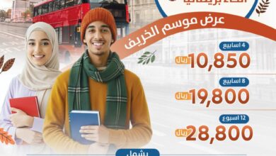 عرض موسم الخريف دراسة اللغة الإنجليزية في جميع أنحاء بريطانيا 4 اسابيع بـ 10,800 ريال 8 اسابيع بـ 19,800…