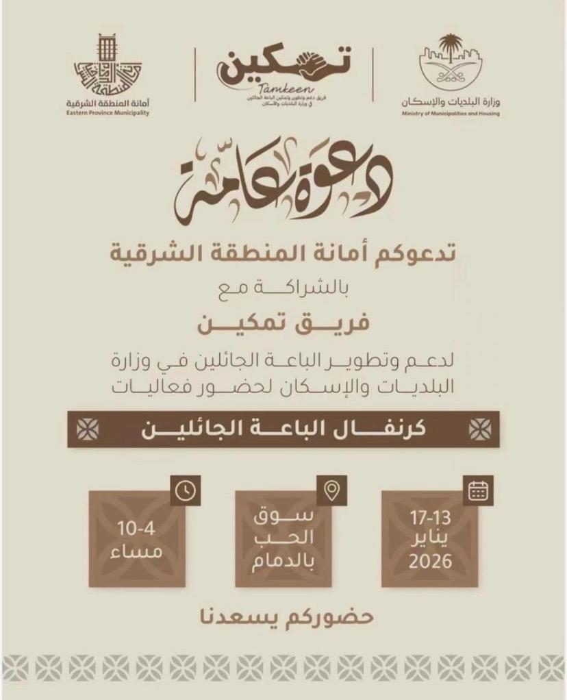 دعت أمانة المنطقة الشرقية، بالشراكة مع فريق تمكين، إلى حضور ورشة الباعة الجائلين، التي تأتي ضمن جهودها لدعم وتمكين الباعة الجائلين وتطوير مهاراتهم، وتعزيز مشاركتهم في الفعاليات المنظمة التابعة لوزارة البلديات والإسكان.