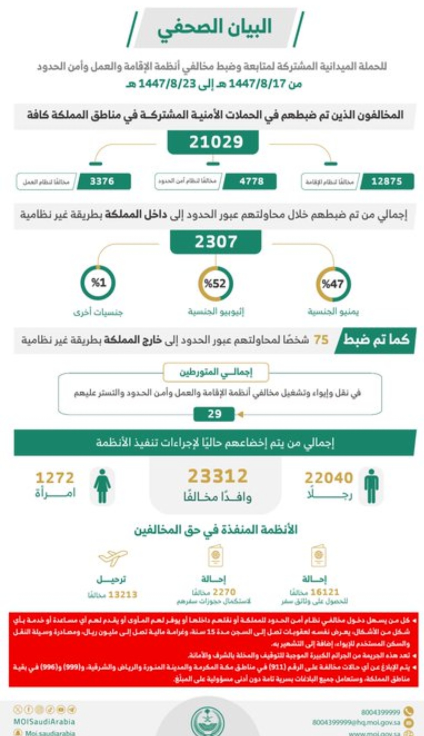 أولاً: بلغ إجمالي المخالفين الذين تم ضبطهم بالحملات الميدانية الأمنية المشتركة في مناطق المملكة كافة (21029) مخالفًا، منهم (12875) مخالفًا لنظام الإقامة، و(4778) مخالفًا لنظام أمن الحدود، و(3376) مخالفًا لنظام العمل.