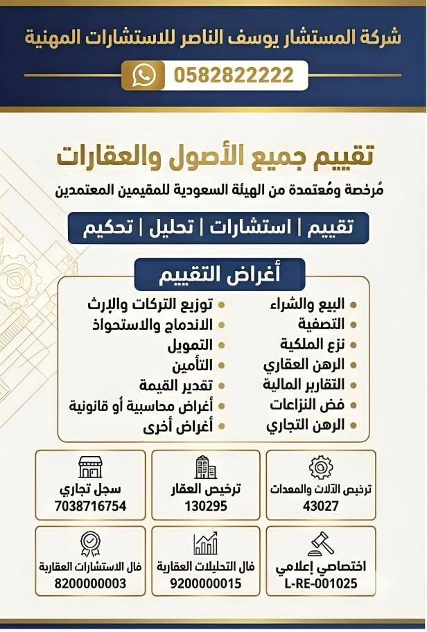 نقدّم في شركة المستشار يوسف محمد الناصر للاستشارات المهنية خدمات التقييم المعتمدة وفق أعلى المعايير المهنية والدولية، وباعتماد رسمي يضمن موثوقية التقارير وقبولها لدى الجهات القضائية والرسمية.