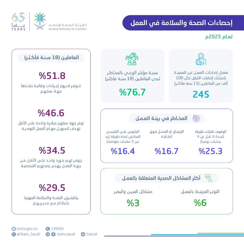 وأظهرت النتائج أن الوقوف لفترات طويلة (لمدة لا تقل عن 4 ساعات يوميًا) تعد من أعلى المخاطر الصحية التي يواجهها العاملون (18 سنة فأكثر) في بيئة العمل بنسبة 25.3%، مبينة أنه خلال الأشهر الاثني عشر الماضية كانت أكثر المشكلات الصحية المرتبطة بالعمل شيوعًا هي “التوتر المرتبط بالعمل” بنسبة 6%، تليها “مشاكل العين والبصر” بنسبة 3%، وبلغت نسبة مؤشر الوعي عن المخاطر لدى العاملين 76%.