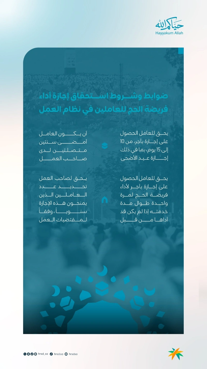 حددت وزارة الموارد البشرية والتنمية الاجتماعية، ضوابط وشروط استحقاق إجازة أداء فريضة الحج للعاملين في نظام العمل.