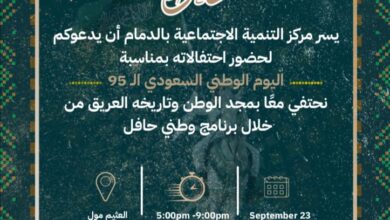 بشائر: جيهان البشراوي مركز التنمية الاجتماعية بالدمام بالتعاون سيحتفي مع العثيم مول بفعاليات اليوم الوطني السعودي الموافق 23 سبتمبر، وذلك…