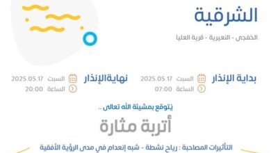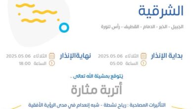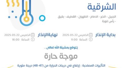 بالإنذار الأصفر.. “الأرصاد” ينبه من موجة حارة على المنطقة الشرقية