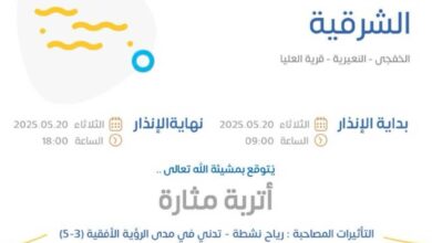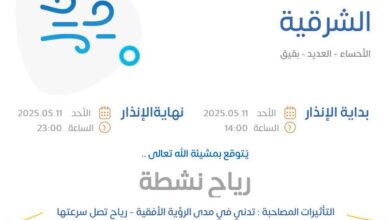 بشائر: الدمام نبه المركز الوطني للأرصاد، من رياح نشطة وتدن في الرؤية الأفقية، على أجزاء من الشرقية يوم الأحد. وأصدر…