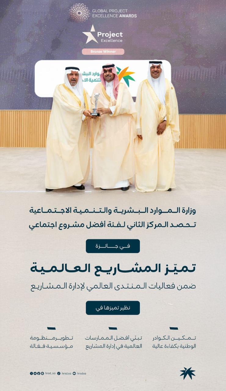 حصدت وزارة الموارد البشرية والتنمية الاجتماعية المركز الثاني (البرونزي) في جائزة التميز في المشاريع العالمية ضمن فئة أفضل مشروع اجتماعي، وذلك خلال فعاليات المنتدى العالمي لإدارة المشاريع.