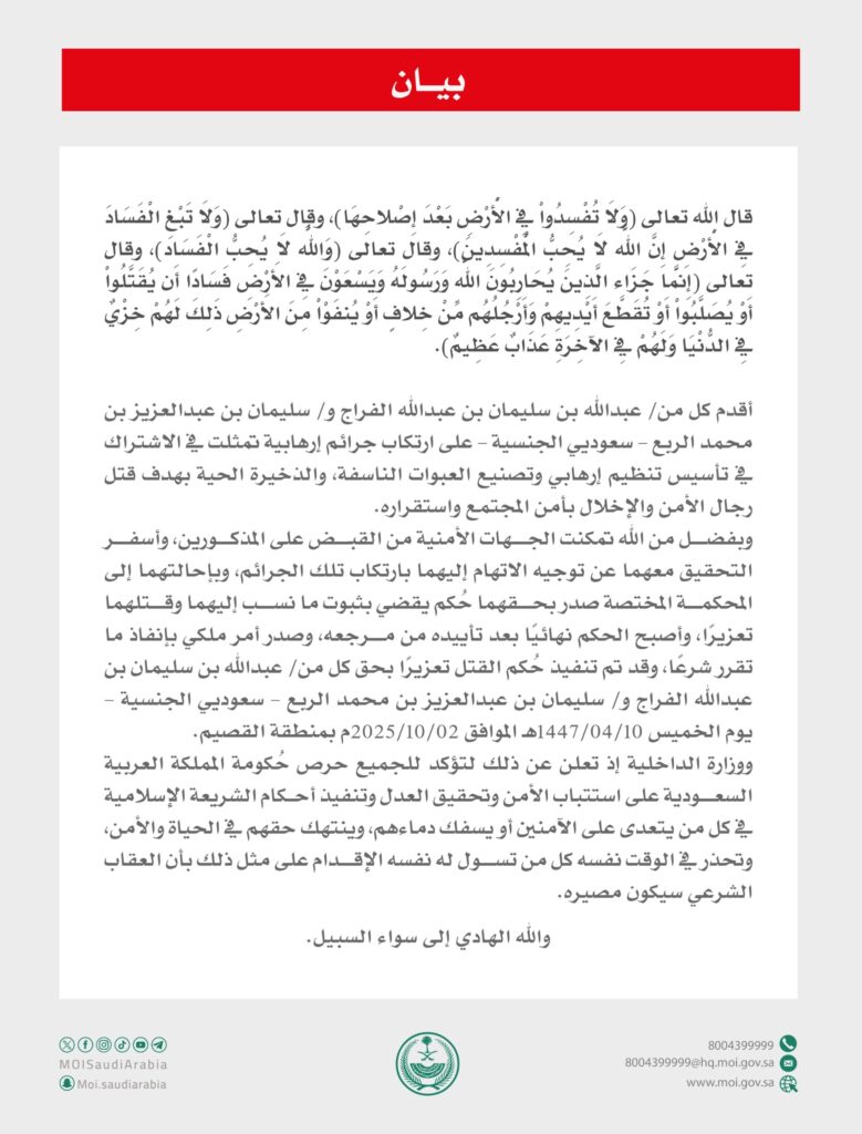 وأكد البيان أن التحقيقات أظهرت ما ارتكباه من جرائم تهدف إلى زعزعة الأمن وإثارة الفتنة الطائفية، مشيرة إلى أن المحكمة الجزائية المتخصصة أصدرت بحقهما حكماً بالقتل تعزيراً، وتم تأييده من محكمة الاستئناف ثم من المحكمة العليا، وصدر الأمر الملكي بإنفاذ الحكم.