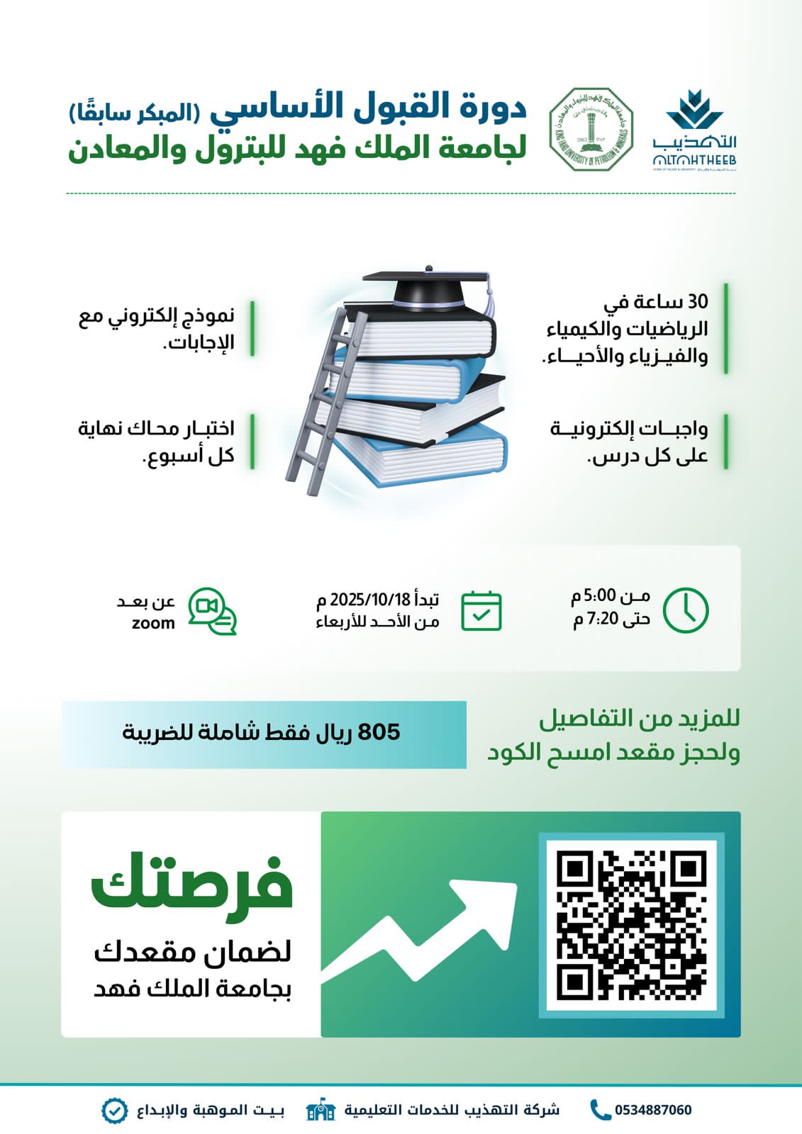 يسر مدارس التهذيب الإعلان عن بدء التسجيل في دورة اختبار القبول الأساسي ( المبكر سابقاً ) لجامعة الملك فهد للبترول والمعادن