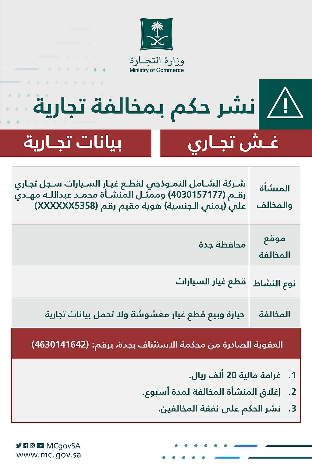 شهرت وزارة التجارة بشركة قطع غيار سيارات ومدير الشركة إثر صدور حكم قضائي يدينهما بمخالفة نظامي مكافحة الغش التجاري والبيانات التجارية لحيازتهما وبيعهما قطع غيار مغشوشة ولا تحمل بيانات تجارية.