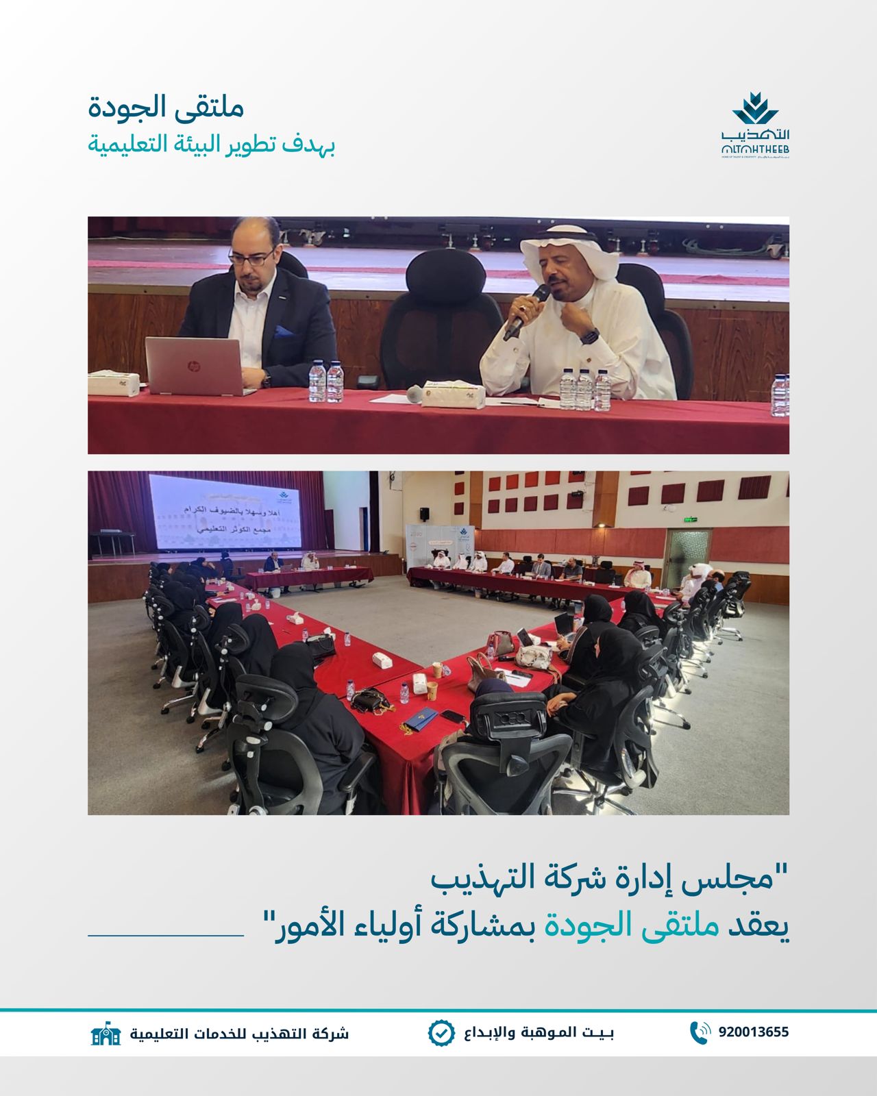 في إطار حرص شركة التهذيب للخدمات التعليمية على تعزيز مبدأ الشراكة الفاعلة مع أولياء الأمور، وترسيخ ثقافة الجودة في التعليم والتعلّم، نظّم مجلس إدارة الشركة ملتقى الجودة بمشاركة ممثلين عن أولياء الأمور من جميع مدارس التهذيب، بهدف مناقشة المقترحات والملاحظات الهادفة إلى تطوير البيئة التعليمية والارتقاء بالأداء الأكاديمي والإداري.