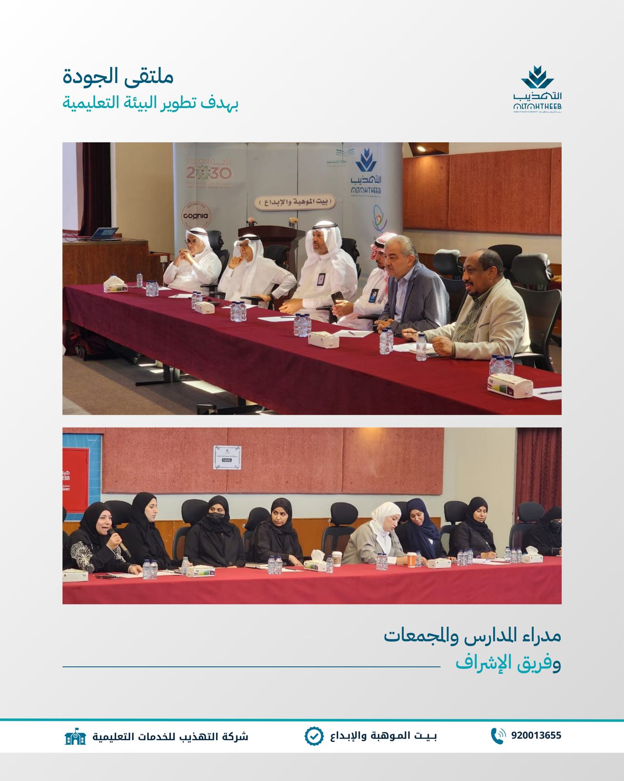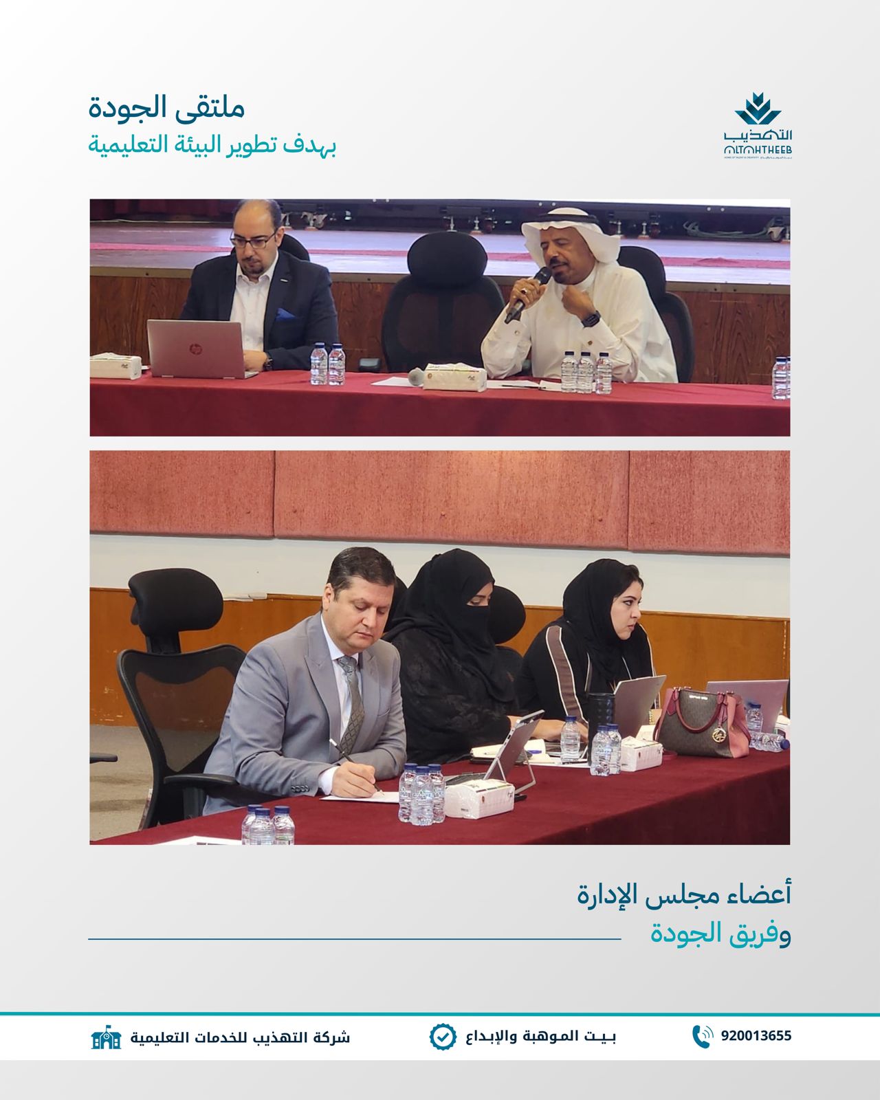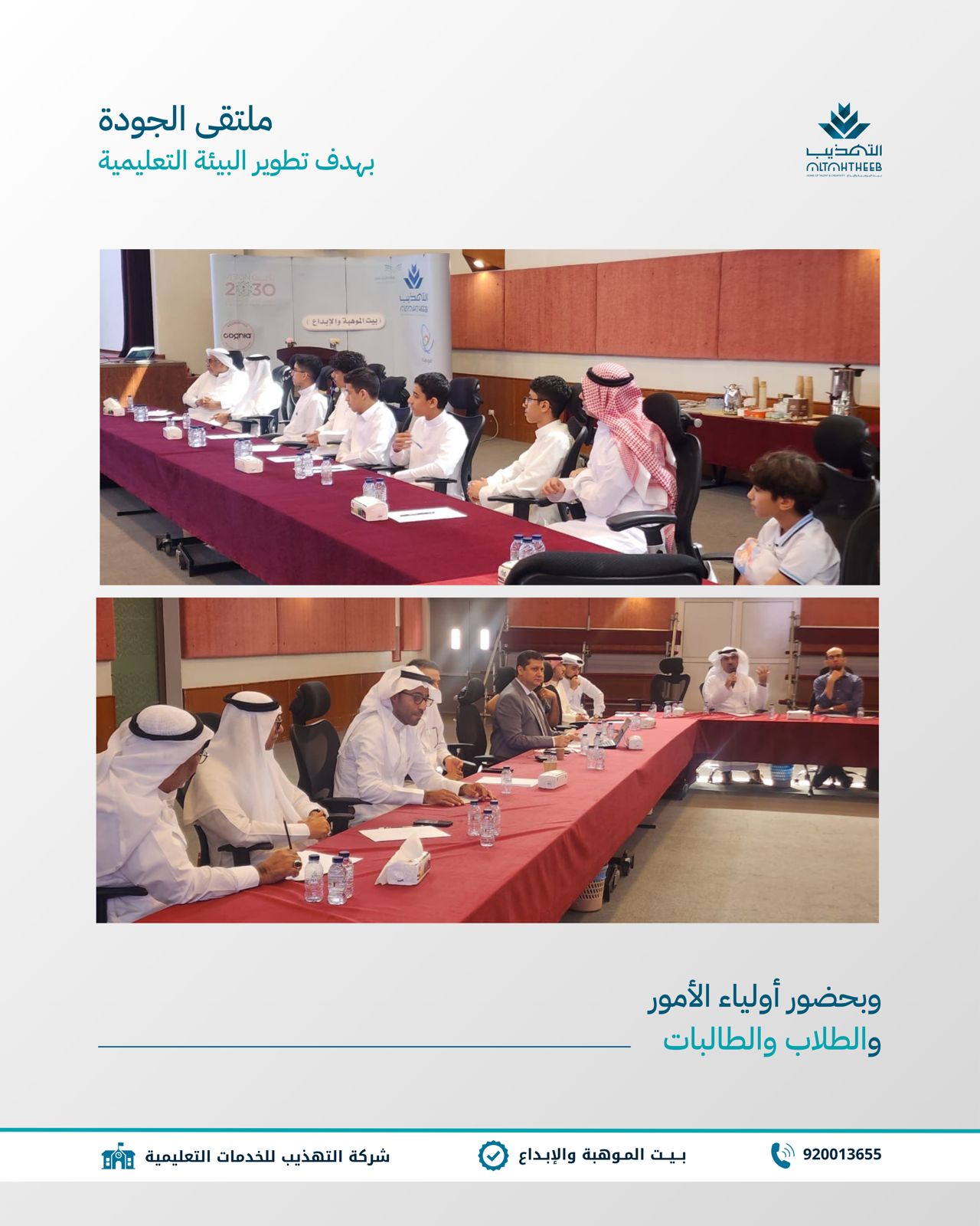 في إطار حرص شركة التهذيب للخدمات التعليمية على تعزيز مبدأ الشراكة الفاعلة مع أولياء الأمور، وترسيخ ثقافة الجودة في التعليم والتعلّم، نظّم مجلس إدارة الشركة ملتقى الجودة بمشاركة ممثلين عن أولياء الأمور من جميع مدارس التهذيب، بهدف مناقشة المقترحات والملاحظات الهادفة إلى تطوير البيئة التعليمية والارتقاء بالأداء الأكاديمي والإداري.