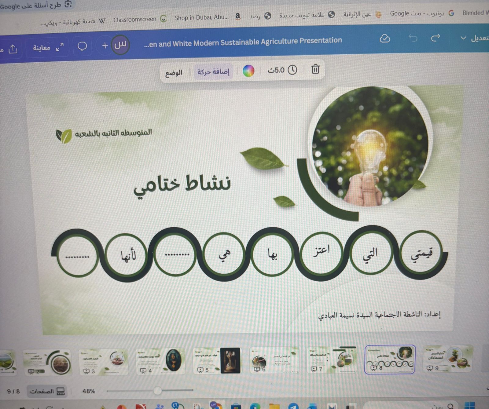 لما للوقت من قيمة زمنية وأهمية كبرى، ولكونه ثروة حقيقية لا يمكن إرجاعها عند التفريط فيها، أقامت الناشطة الاجتماعية نسيمة العبادي صباح اليوم محاضرة مدمجة بالعرض المرئي بالمدرسة المتوسطة الثانية بالشعبة للبنات تحت إشراف رائدة النشاط المدرسي سميرة بوسهيل التي أدارت المحاضرة، وقائدة المدرسة زبيدة الزهراني، بعنوان(من الجذور يبدأ النور)، لتوعية الطالبات بأهمية إدارة الوقت وتنظيمه لتحقيق النجاح والتوازن في حياتهن الدراسية والاجتماعية، ولتحفيزهن على السعي نحو التفوق والتميز انطلاقًا من الجذور القوية: القيم، والطموح، والانضباط، مستخدمة وسائل وأدوات حسية تجذب الطالبات وتعين على إيصال المعنى.