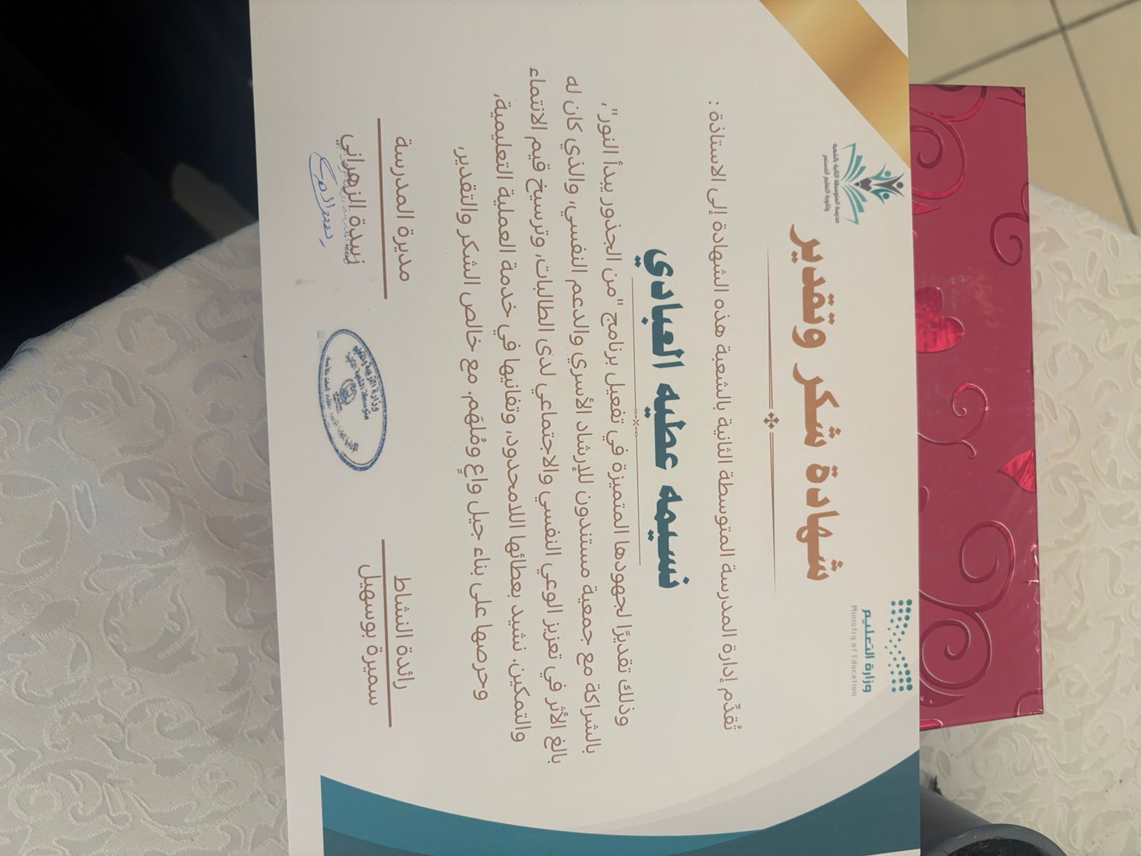 وفي ختام الفعالية قدمت قائدة المدرسة زبيدة الزهراني للمحاضرة العبادي شهادة شكر وتقدير وهدية رمزية، لما بذلته من جهد وما منحته من وقت في سبيل توعية الطالبات، والتقطت الصور التوثيقية للحدث.