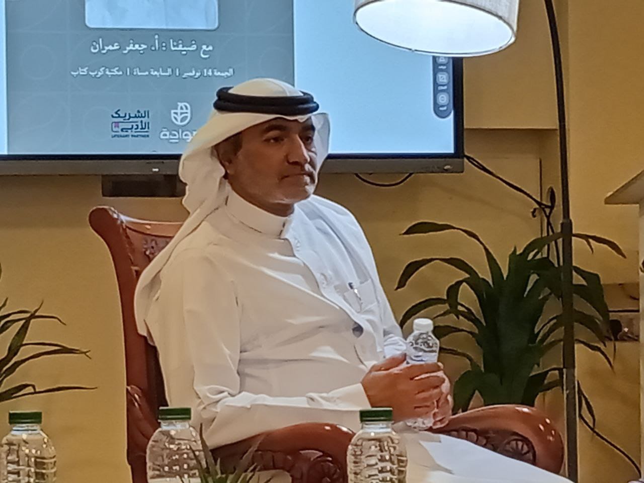 بدأ الجلسة الحوارية مديرها القاص هاني الحجي بتقديم السيرة الذاتية لضيفه فقال: (جعفر عمران معلم لغة عربية، وصحافي مستقل بموجب وثيقة العمل الحر، يشارك في مشروع الكتب الفاخرة في هيئة التراث السعودي لتحرير السياق والمراجعة، ومشارك في كتابة مسلسل خيوط المعازيب، ورئيس ورشة النص، وكاتب سيناريو وأفلام وثائقية. قدم عددًا من الورش والدورات في الصحافة والسيناريو. لديه مجموعة من المؤلفات أبرزها سالفة طويهر مجموعة قصصية، ذاكرة المكان، أنا الإعلامي أنا الإعلامية، رواية مخطوطة، اليأس يشرب سفن آب، وساهم في إعداد كتاب (إبراهيم الحساوي من مسرح القريةإلى الشاشة العالمية)، وهو صحافي متعاون في عدد من الصحف المحلية وجريدة الحياة، وهو عضو ومؤسس في نادي أصدقاء السرد).