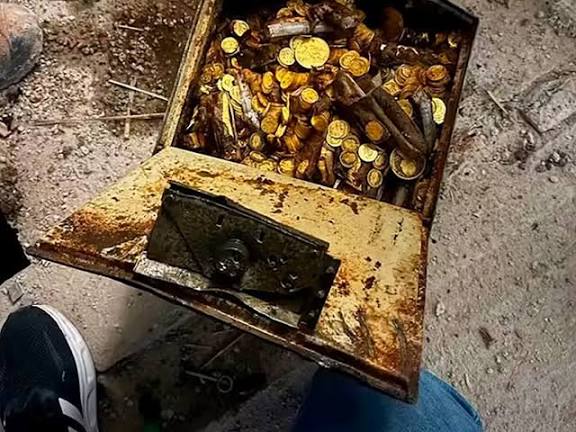 وأثناء الحفر عثر العمال على عدة أكياس بلاستيكية تحتوي على خمس سبائك ذهب وعدد كبير من العملات المعدنية، جميعها معبأة بعناية وكأنها أخفيت عمدا.