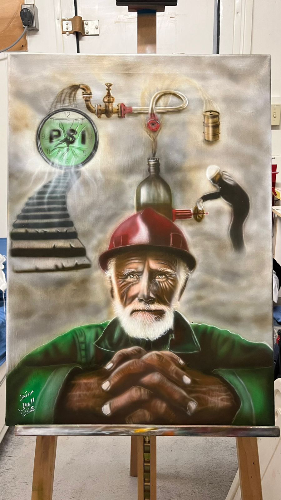 في هذه اللوحة معاناة رجال يعمل في مجال بالبترول، يريد أن يتخطى ضغوطات العمل والوقت بشكل مختصر،