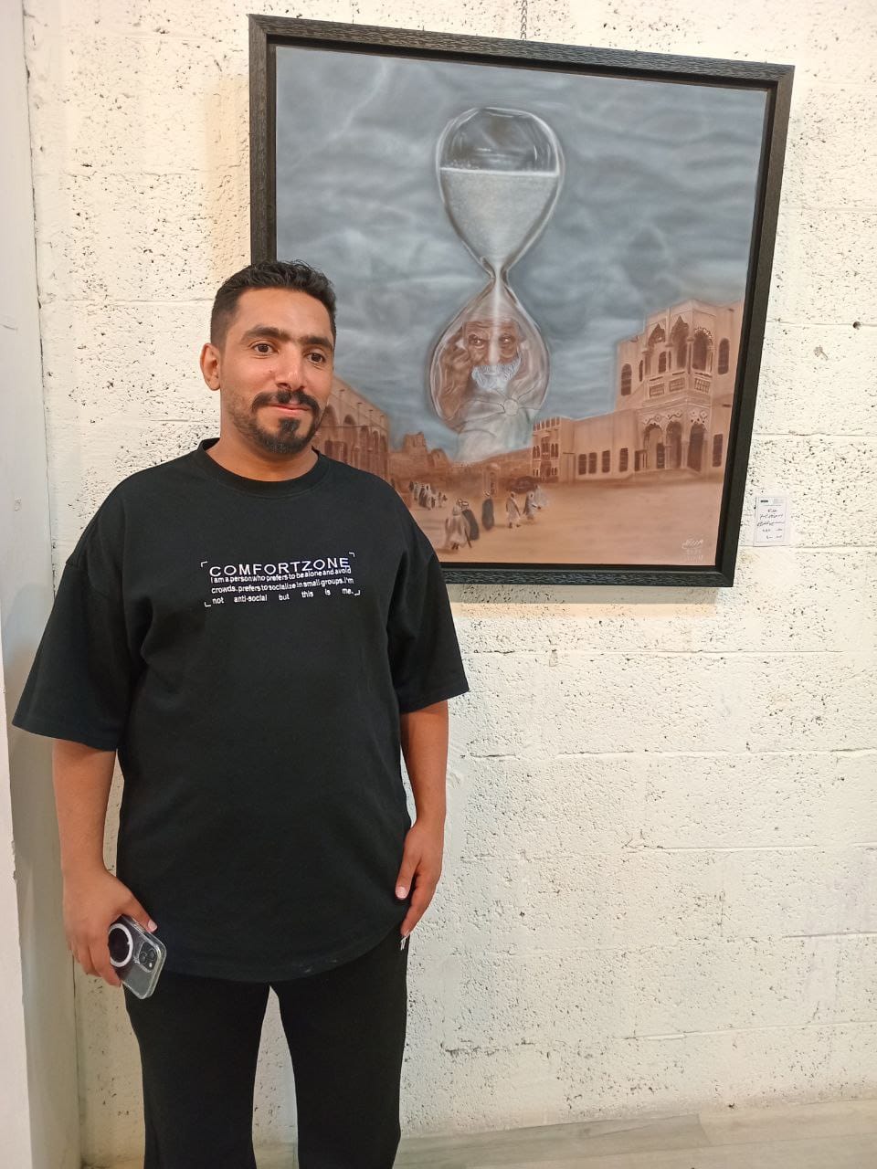 بالبداية كان الشغف منذ الصغر بالمدرسة الابتدائية والمتوسطة، وكنت مهوسًا برسم الطبيعة والمباني القديمة والتشكيل بالصلصال. وقطعت فترة طويلة إلى عام ٢٠٢١م، وكان المحفز الأول لي الفنان المصري كريم عادل شجعني وأعطاني الدافع لتعلم مبادى فن البورتريه بقلم الرصاص والفحم، وصقلت الموهبة بتعلم تقنيات الألوان الزيتية، وفن الآيربرش عام ٢٠٢٢م على يد الفنان حافظ الرضي، وطورت هذه التقنية من خلال التغذية البصرية بالسوشل ميديا، وطورت في فن الآيربرش بتعدد الخامات انطلاقًا من ألوان الأكليريك إلى الألوان النارية وألوان حبر بالآيربرش.