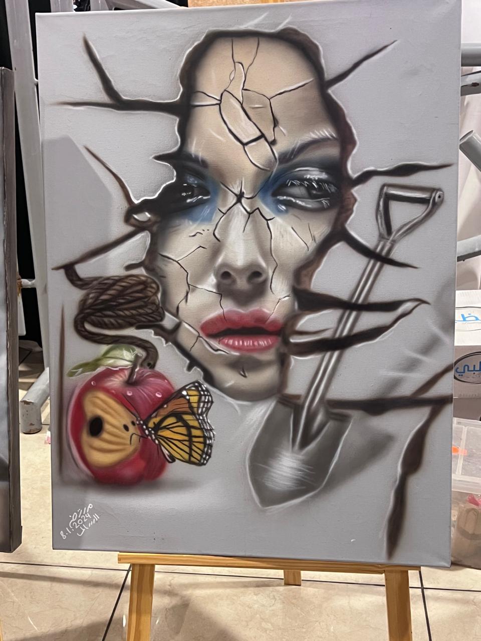 بالبداية كان الشغف منذ الصغر بالمدرسة الابتدائية والمتوسطة، وكنت مهوسًا برسم الطبيعة والمباني القديمة والتشكيل بالصلصال. وقطعت فترة طويلة إلى عام ٢٠٢١م، وكان المحفز الأول لي الفنان المصري كريم عادل شجعني وأعطاني الدافع لتعلم مبادى فن البورتريه بقلم الرصاص والفحم، وصقلت الموهبة بتعلم تقنيات الألوان الزيتية، وفن الآيربرش عام ٢٠٢٢م على يد الفنان حافظ الرضي، وطورت هذه التقنية من خلال التغذية البصرية بالسوشل ميديا، وطورت في فن الآيربرش بتعدد الخامات انطلاقًا من ألوان الأكليريك إلى الألوان النارية وألوان حبر بالآيربرش.