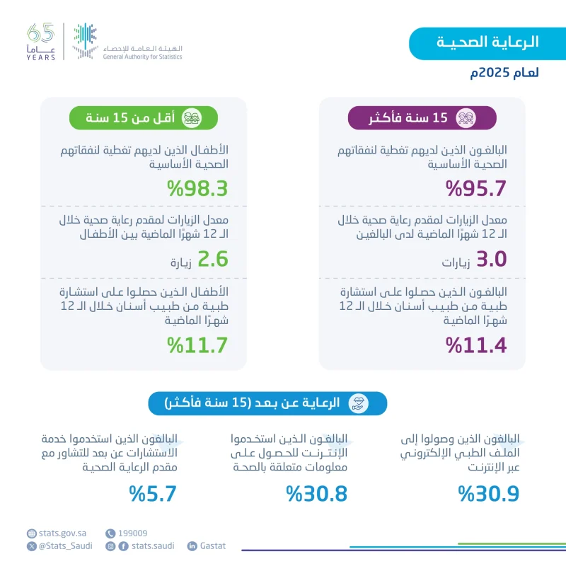 كما كشفت النتائج التي أعلنتها الهيئة العامة للإحصاء، اليوم (الأحد)، أن 30.9% من البالغين بأعمار 15 سنة فأكثر قد وصلوا إلى الملف الطبي الإلكتروني عبر الإنترنت، وأن 3 زيارات هو معدل الزيارات لمقدم رعاية صحية خلال الأشهر الـ 12 الماضية للبالغين، فيما كان المعدل عند الأطفال أقل من 15 سنة هو 2.6 زيارة.