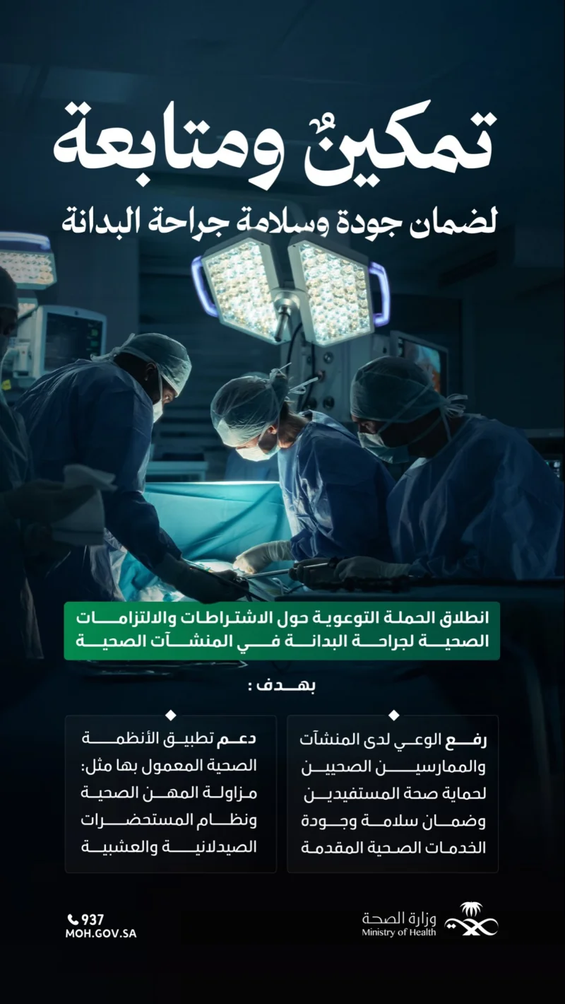 دشنت وزارة الصحة، أمس (الأحد)، حملة توعوية حول الاشتراطات والالتزامات الصحية لجراحة البدانة في المنشآت الصحية؛ بهدف رفع الوعي وتعزيز الالتزام بالأنظمة الصحية، وضمان سلامة وجودة الخدمات الصحية المقدّمة للمستفيدين.