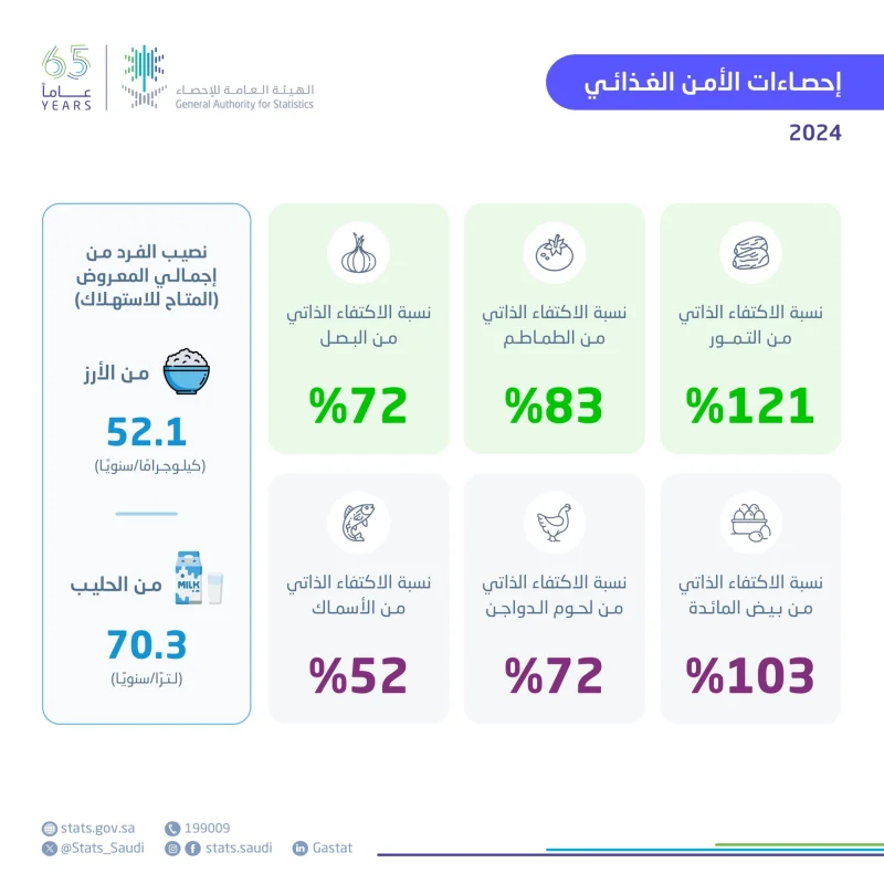 أعلنت الهيئة العامة للإحصاء، اليوم (الخميس)، أن المملكة حققت مستويات اكتفاء ذاتي تتجاوز 100% لمجموعة من المنتجات النباتية والحيوانية خلال عام 2024، حيث بلغ الاكتفاء الذاتي من التمور 121%، ومن منتجات الألبان 131%، ومن بيض المائدة 103%، إضافة إلى تحقيق 102% للبامية، و101% للخيار.