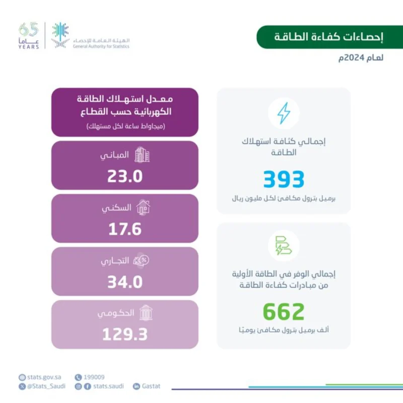 ووفق الإحصاءات، شهد إجمالي الوفر في الطاقة الأولية الناتج عن مبادرات كفاءة الطاقة ارتفاعًا بنسبة 22.8% مقارنة بعام 2023م، ليصل إلى 662 ألف برميل بترول مكافئ يوميًا، حيث بلغ الوفر في المباني (سكني، حكومي، وتجاري) 484 ألف برميل بترول مكافئ يوميًا، وفي قطاع النقل 70 ألف برميل بترول مكافئ يوميًا، وفي قطاع الصناعة 41 ألف برميل بترول مكافئ يوميًا.