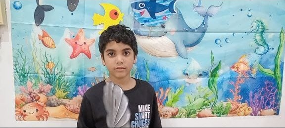 ثم رسم الأطفال أسماك القرش والأسماء الذهبية بعد مشاهدة خطوات الرسم بخطوط مبسطة للغاية، ومن ضمنها بعض الأرقام الإنجليزية.